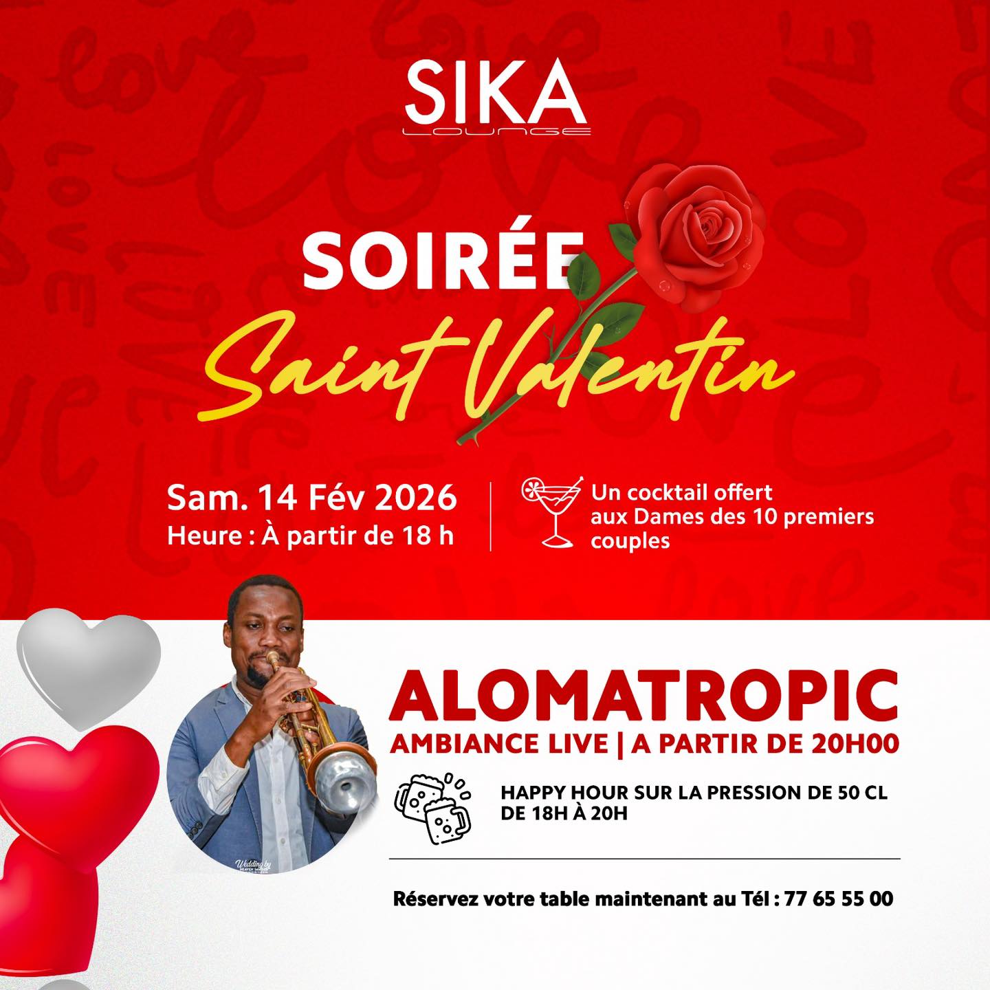 10 Fév Soirée Saint-Valentin simone 0 Actualite, Home 1 Cette Saint-Valentin, laissez la magie opérer au Sika Lounge ! Préparez-vous à une soirée où musique, rires et complicité se rencontrent: Cocktails offerts aux dames des dix premiers couples Happy Hour de 18h à 20h sur la pression de 50cl Ambiance live avec le groupe Alomatropic à partir de 20h Réservez vite et soyez parmi les premiers à vivre ce moment unique ! ___________ Jardin arboré | Terrasse climatisée Tél : +226 77 65 55 00 Suivez-nous sur Instagram : @sikalounge #SikaLounge #lounge #barlounge #restaurant Share